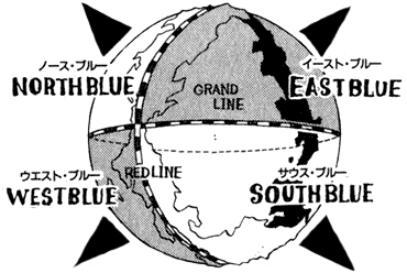 One Piece takes place in a fictional world where most of the planet is covered in water. Only one continent, the Red Line, exists and it runs continuously north to south along the center of the globe. Running opposite to the Red Line is the Grand Line, a massive ocean current that circles the globe east to west. Together, the Red Line and Grand Line divide the waters of the world into four separate oceans: North Blue, East Blue, South Blue and West Blue. Most of the people in the world live in these four quadrants.